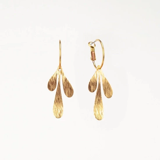 Brushed brass graphic leaf charm on lever back hoop with stainless steel ear wire. 2 inches long, .75 inches wide