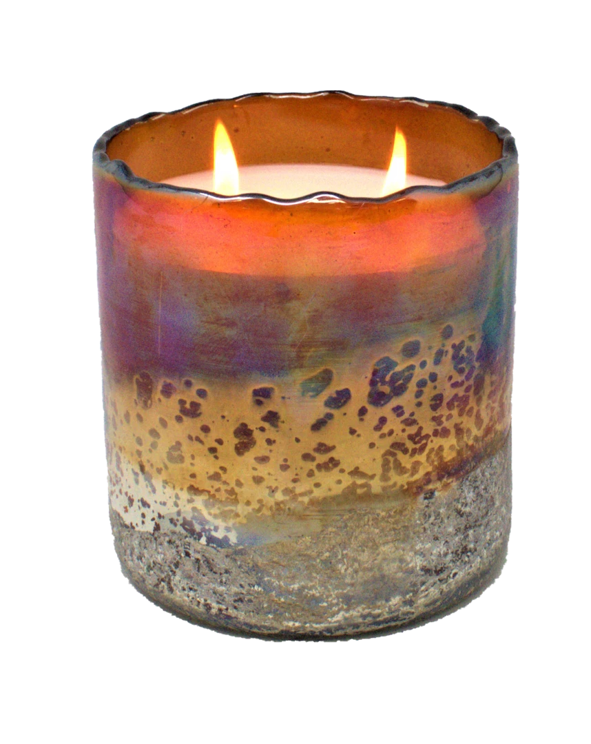 The new Horizon candles are truly one of a kind, artistic pieces that evoke beautiful images of horizon landscapes. They have a textured gold and/or silver finish at the base and a shiny, smooth finish at the top. This candle has two wicks and is four inches by five inches tall. This candle container is made of thick glass, hand blown in four colors with uneven rims – a one of a kind centerpiece suited for every style. Each piece will vary in its finish and texture. The Horizon Collection candles are hand poured in Georgia, by experienced candle makers, with twenty-two ounces of a clean burning, United States grown, fragranced soy wax blend with a high-quality fragrance compound oil. The distinctive fragrances are saturated with layers of nuance, complex and intricate, and are designed to evoke a particular time and place, triggered by memories and nostalgia. These beautiful vessels are individually created by artists all over the world. Every candle is crafted in small batches, by artisans with meticulous attention to details from mixing of the ingredients, hand pouring the wax, adding the dustcovers, and boxing the candles.