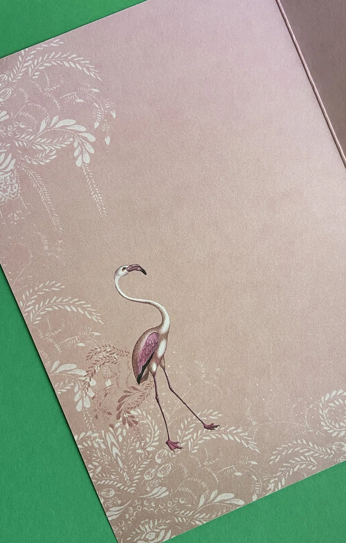 “Fabulous Flamingo” 5″ X 7″ PAPAYA fine Greeting Cards are embellished with gold foil details and rich matte paper. Interior is blank inside and gently illustrated with full color designs. Paired with a special “To and From” screen printed labels. Individually sealed & printed on recycled paper.