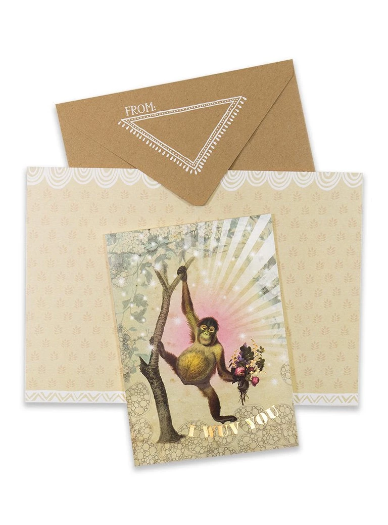 “I Wuv You” 5″ X 7″ PAPAYA fine Greeting Cards are embellished with gold foil details and rich matte paper. Interior is blank inside and gently illustrated with full color designs. Paired with a special “To and From” screen printed labels. Individually sealed & printed on recycled paper.