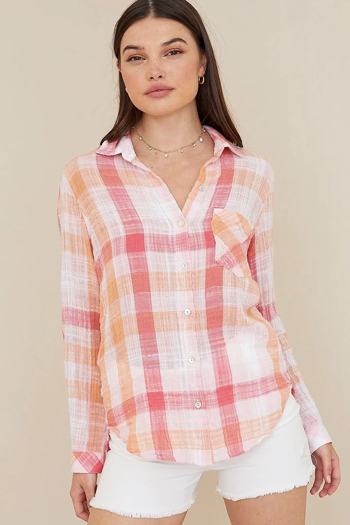 Bella Dahl’s favorite button down featured in a summer sunset plaid print, single breast pocket and long sleeve with button cuffs. The hand on this pretty blouse is amazingly soft and pretty!