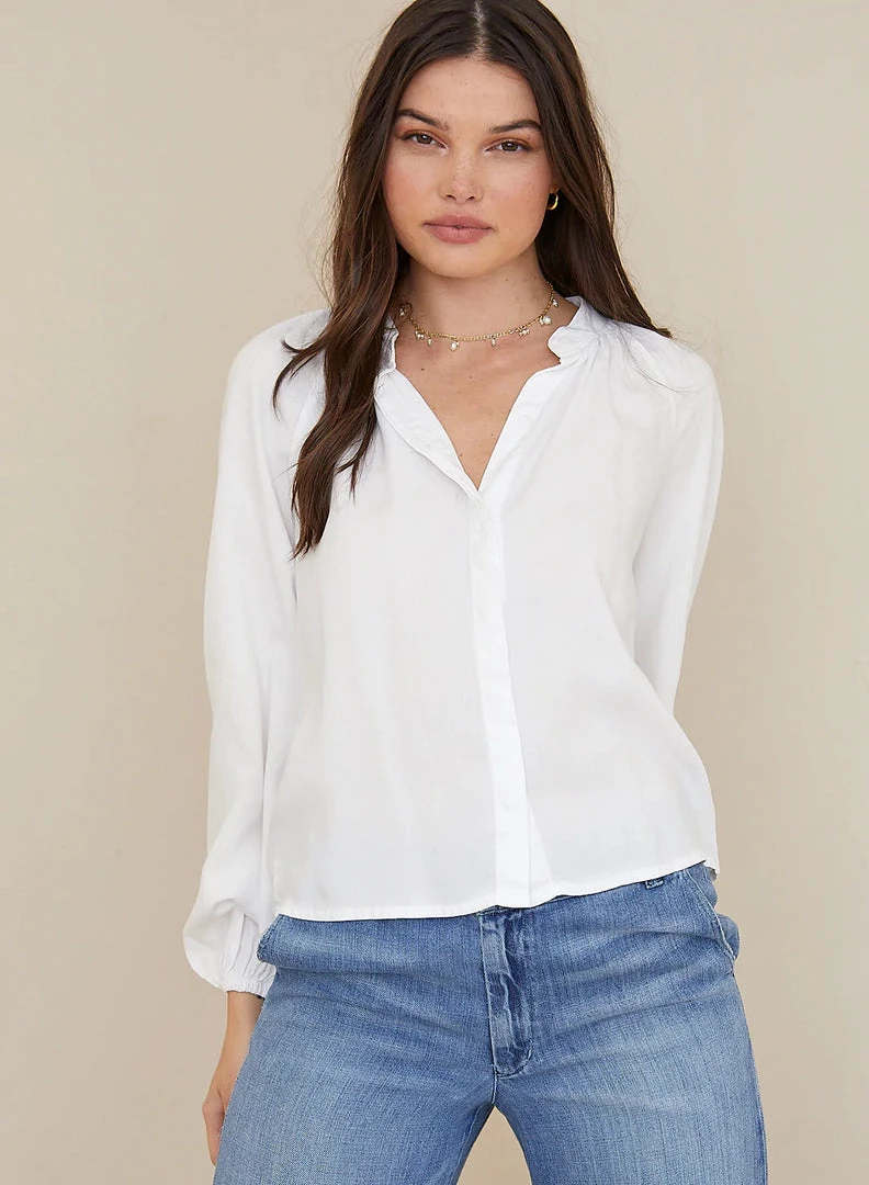 This eco friendly sustainable shirt features raglan sleeves with shirring details, button down front and elastic cuff on the sleeves.