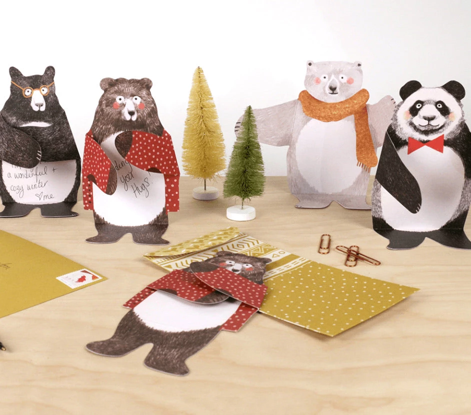 Wrap your message up in a bear hug! With folded hugging arms and scored waists for a seated display, these 12 die-cut bear cards—including polar, panda, brown, and black bears—are ready to send warm thoughts and a big hug for any occasion.