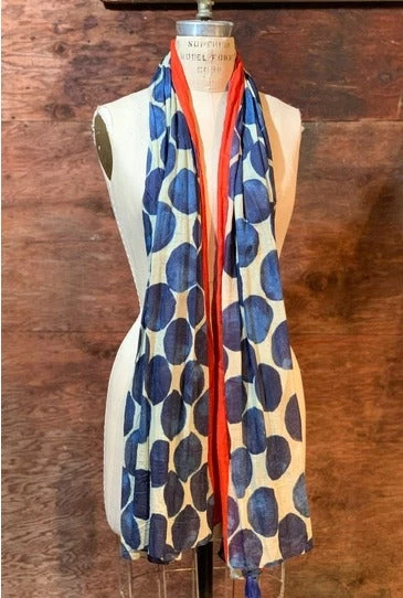 This beautiful 100% cotton scarf is made in India, where the fabric is hand block printed. This classic polka dot scarf with an orange border and a orange tassel at each corner.