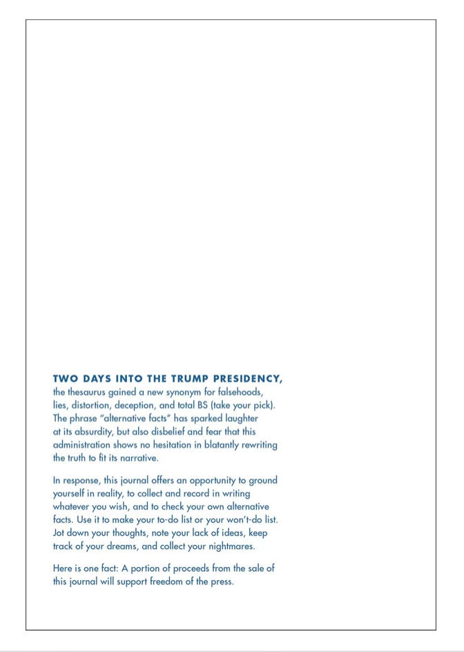 Record your to-do list, or your won’t-do list. Jot down your thoughts, note your lack of ideas. Keep track of your dreams and collect your nightmares. On January 22, two days into the Trump presidency, White House senior advisor Kellyanne Conway appeared on Meet the Press and claimed that the administration was offering “alternative facts” to assertions about the crowd size at Trump’s inauguration. Conway’s remarks struck a chord, or rather a dissonant note, with viewers, who reacted with scathing commentary and biting memes. After a tumultuous few weeks of politics, this lined journal says “Always remember: the facts are whatever you want them to be.”