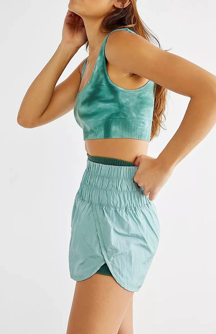 Speed up or slow down in these breezy, warm-up style running shorts, featuring a boldly smocked waistband with a high-rise silhouette and split hem.