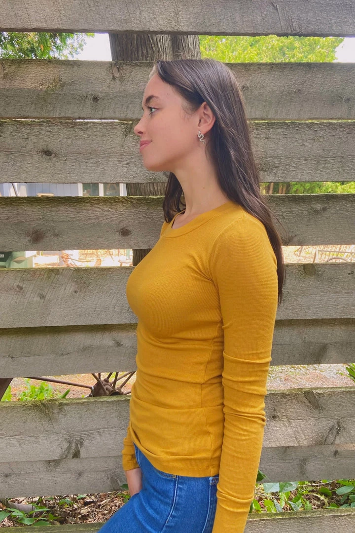 Add some fitted texture to your wardrobe with this cozy waffle knit top. Cute on its own, and easy to layer. A perfect transition tee.