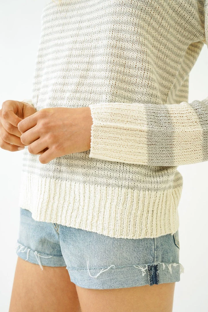 Stripes are always a good idea in the summer. This round neck, drop shoulder striped sweater has a slight boxy fit and a soft hand. Top it over your favorite shorts or dress and voila-summer vibes are on!