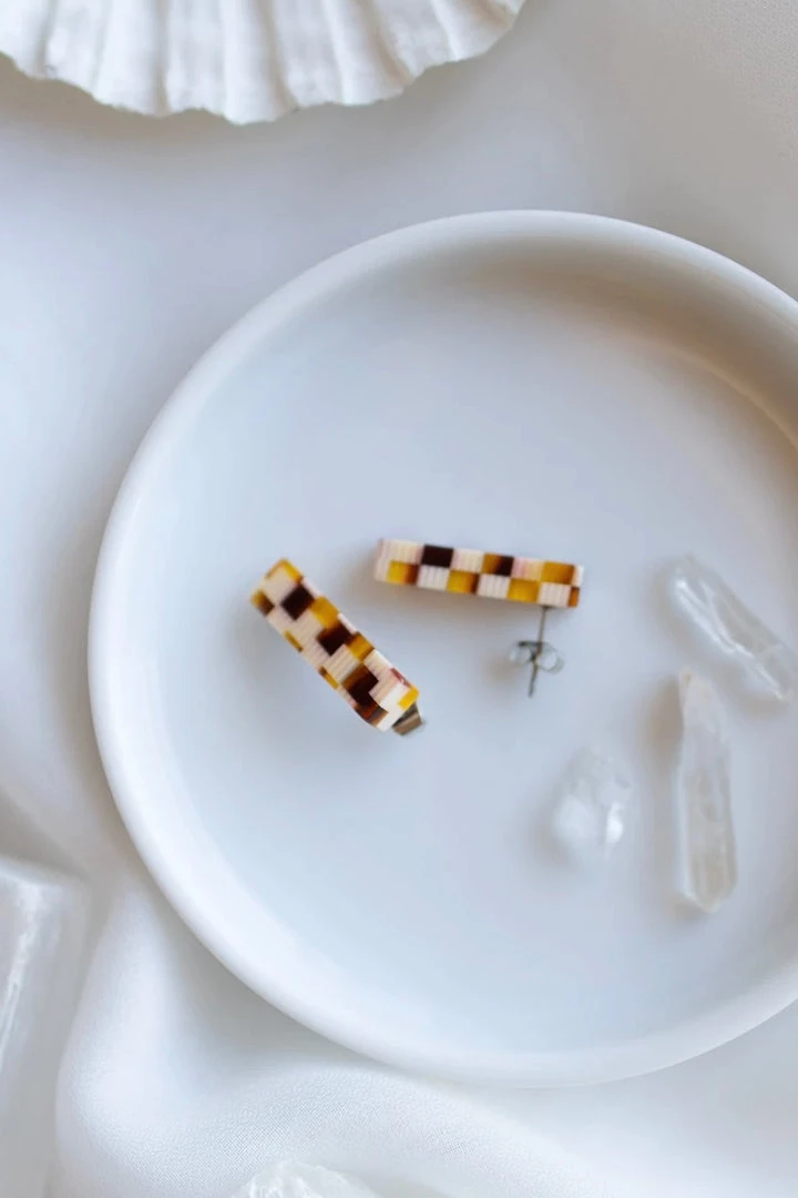 We love these light weight, wearable earrings from Nat & Noor. The material used to make them is a cellulose acetate which is a non-petroleum base coming from wood pulp. Making it renewable resource – Hooray!