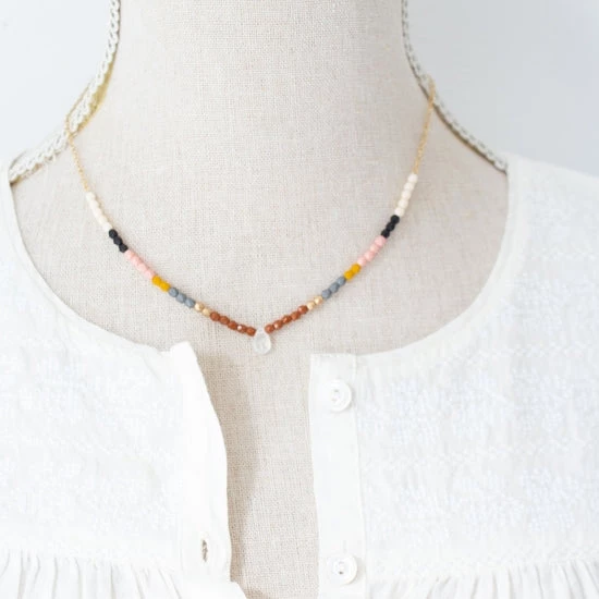 A super dainty bead necklace with a little raw teardrop Moonstone pendant and a 24K antique Gold Plated chain. The tiny 3mm Czech glass beads surround the pendant in a mix of Cream, Black, Blush, Mustard, Grey, Gold, and Brown Amber, Turquoise, Mustard, Pale Grey, and Green. The beaded part is connected seamlessly to the dainty chain and the necklace is finished with a comfy lobster clasp.