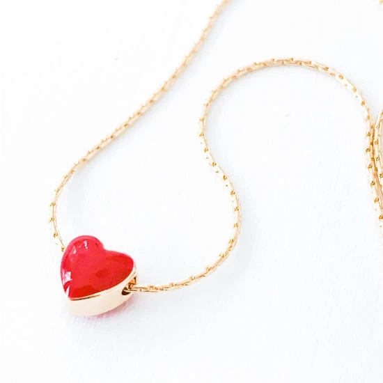 A tiny bright red heart on a dainty 14K Gold Filled chain. The tiny 6x5mm heart is made of bright red enamel and is 24K gold plated, the dainty chain is 14K gold filled, and a comfy lobster clasp. The details: 6x5mm Tiny heart charm 14K GF chain