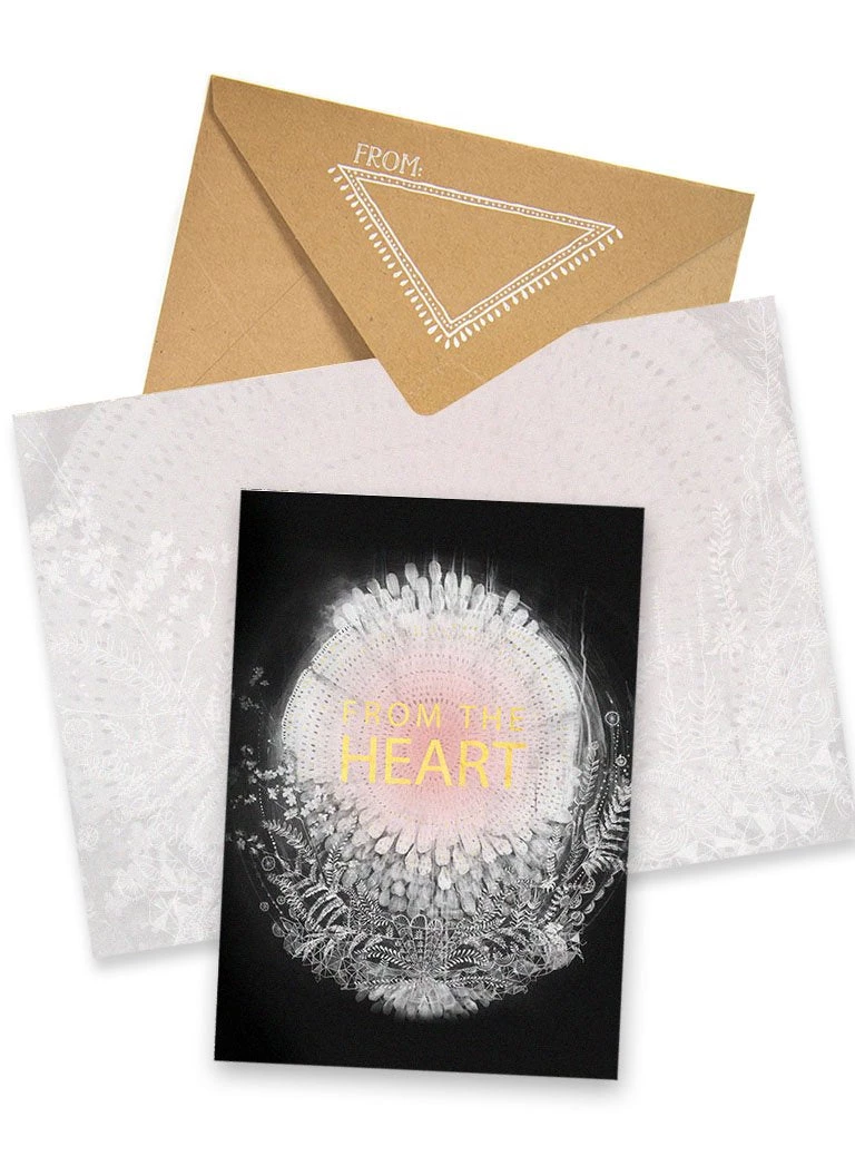 5″ X 7″ PAPAYA fine Greeting Cards are embellished with gold foil details and rich matte paper. Interior is blank inside and gently illustrated with full color designs. Paired with a special “To and From” screen printed labels. Individually sealed & printed on recycled paper.