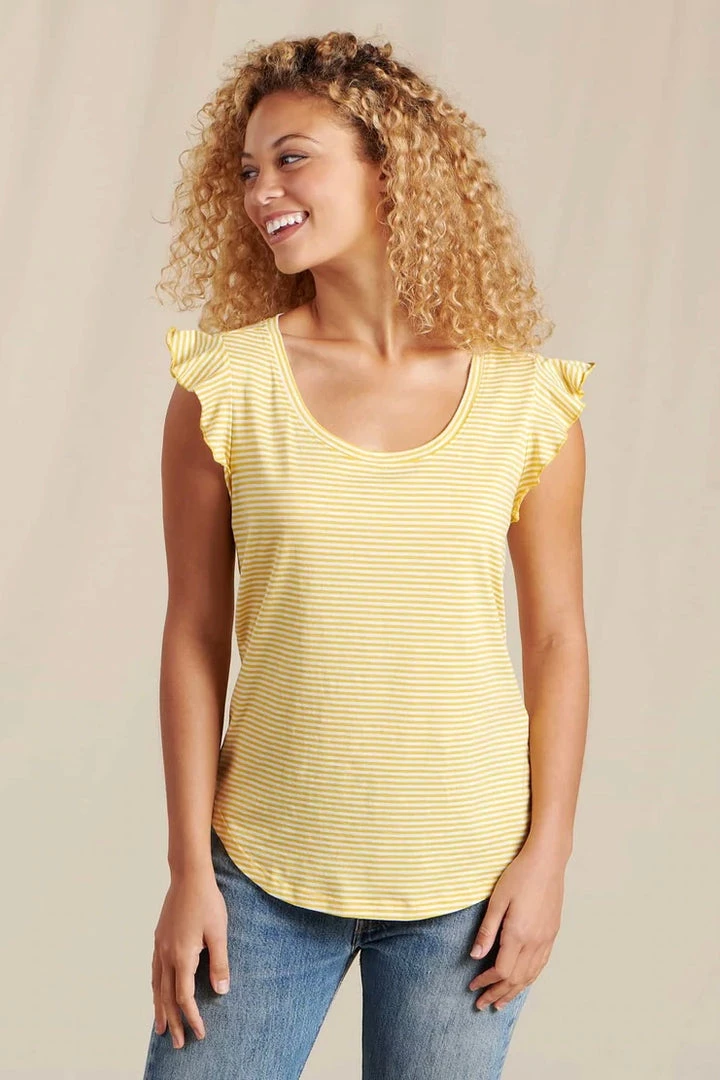 Flirty ruffle cap sleeves make this tee anything but basic. Made from a blend of organic cotton, tencel and elastane, this feminine t-shirt is a fresh twist on a classic scoop neck t-shirt.