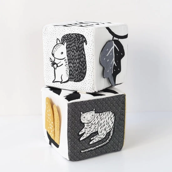 Monkey, flower, jungle power! So much to do and see in one large block. This soft fabric block is designed to delight baby’s developing senses with high-contrast graphics, textures, taggies, and crinkles. Featuring multiple scenes and patterns of jungle life and animals.